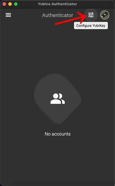 1. To add an account to the Yubico Authenticator application, please click on the “Configure Yubikey” in the upper right corner of the screen, and press the “Add account” displayed on the screen.
