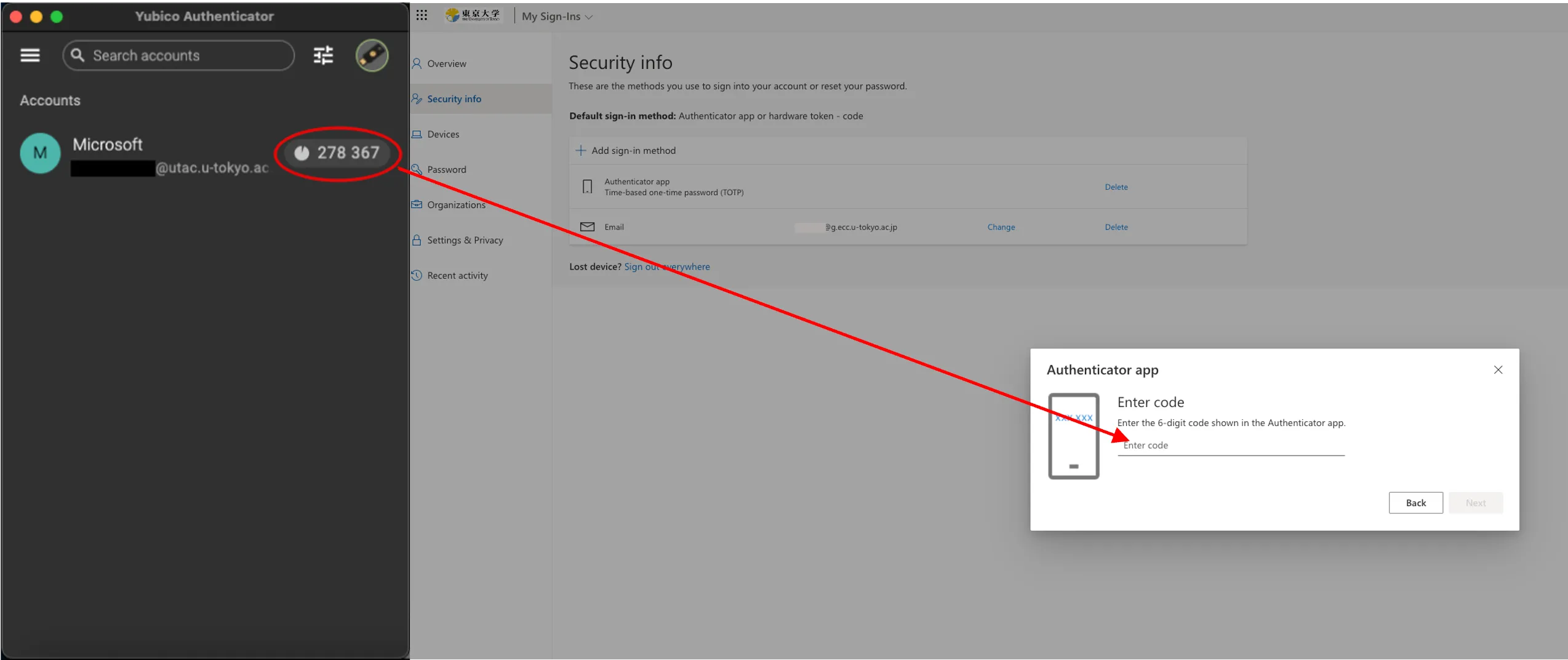2. When the “Enter code” field is displayed, please open the Yubico Authenticator application with YubiKey connected, check the 6-digit number shown in the app and enter the numbers into the input field.