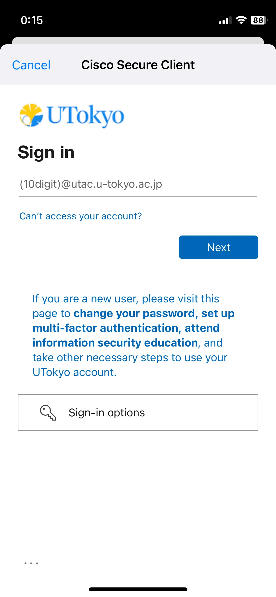 To use UTokyo VPN, you must enable Multi-Factor Authentication in your UTokyo Account. In addition, you are required to have completed the Information Security Education at the specified time. Please refer to the UTokyo VPN home page for details, and then follow the steps below.