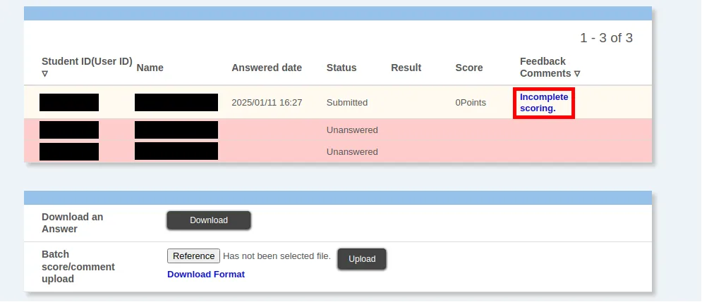 4. If the file is uploaded successfully, the scores and feedback comments in the Excel file for scoring will be loaded, and the status column for the scored students in the “Answer Status” screen will change to “Marked” or “Entered by the instructor”.