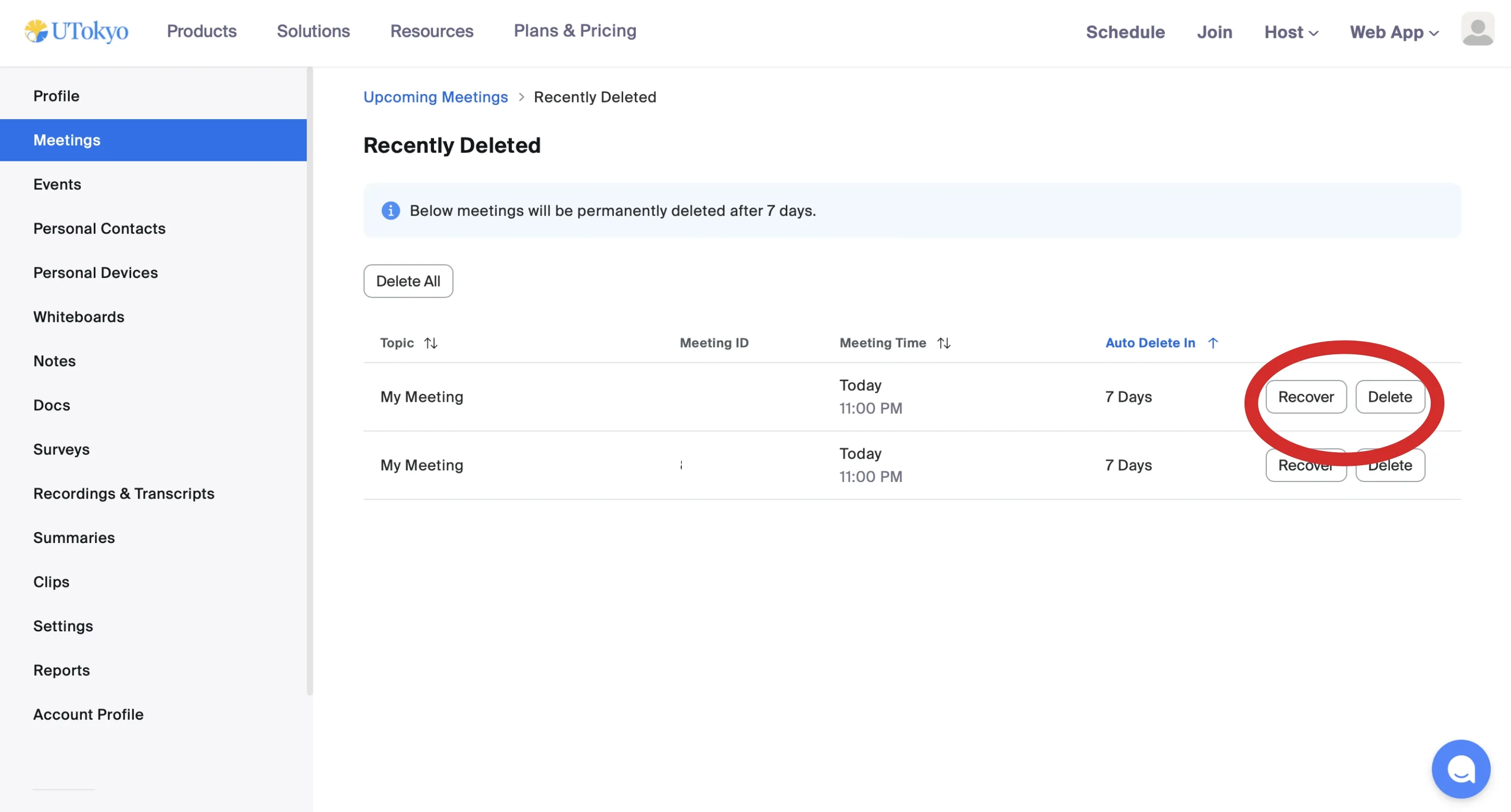 For meetings deleted within 7 days, you can perform the following actions.